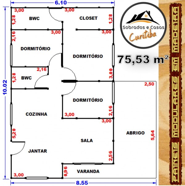 PAINÉIS MODULARES EM MADEIRA(CASAS, KITNETES E CHALÉS) | PAINÉIS MODULARES LINHA BLUMENAU 75,53 m²(CONSTRUÍDO)
